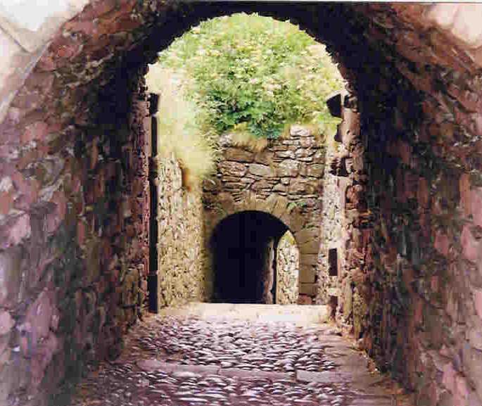 To gain access to the castle, you descend a steep hill andclimb another. On the way, you pass a tunnel leading to the water. The castle's only entrance was through the passage in the far upper left photo. Even horses climbed these stairs to enter the castle.